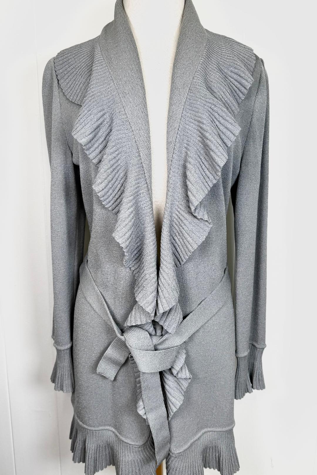 St. John Light Grey Santana Knit Ruffled Kelly Coat – Belted – Size 12