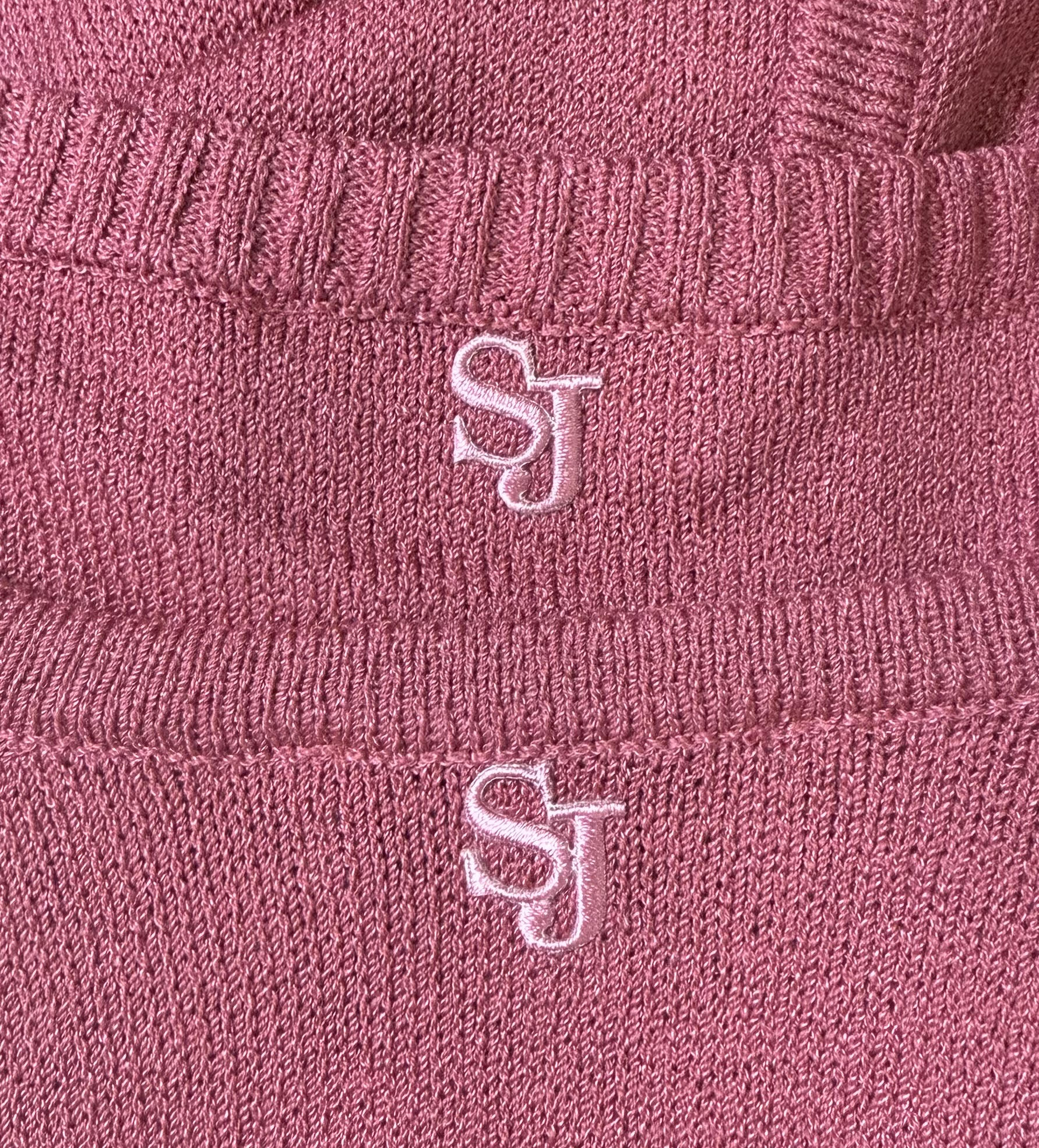 This elegant two-piece set in a soft antique pink santana knit offers timeless style and comfort. The jacket features a round neckline, raglan ¾ sleeves, ribbed cuffs and hem, and 7 small brass buttons down the front. The matching sleeveless top includes a ribbed hem and a subtle logo embroidery on the back. Perfect to mix and match with pants or skirts for a versatile, polished look.