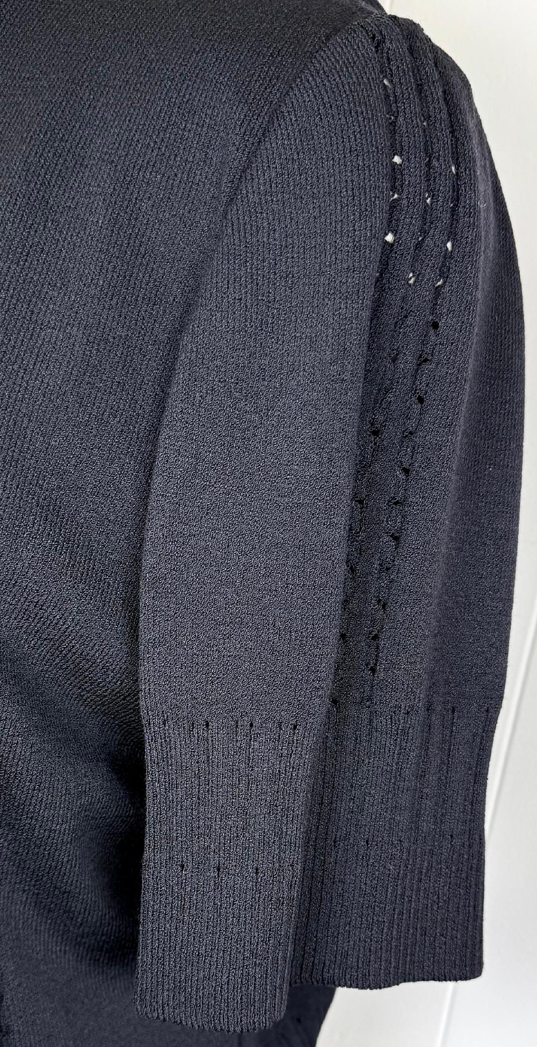 Effortless and versatile, this lightweight St. John black Santana knit jacket features a classic round neckline and six black-and-silver logo buttons. The short sleeves and subtle open-stitch detailing along the sleeves and hem add texture and breathability. A perfect layering piece that complements both casual and polished ensembles.