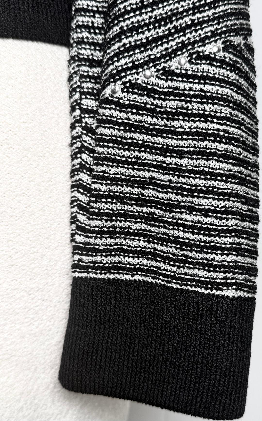 Very nice jacket in textured black santana knit with silver metallic yarn. Zipper on the front with silver logo zipper pull. Black collar, cuffs and bottom. Silver paillettes. Sporty and a little dressy.